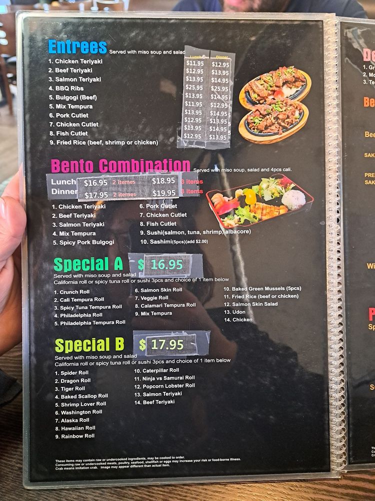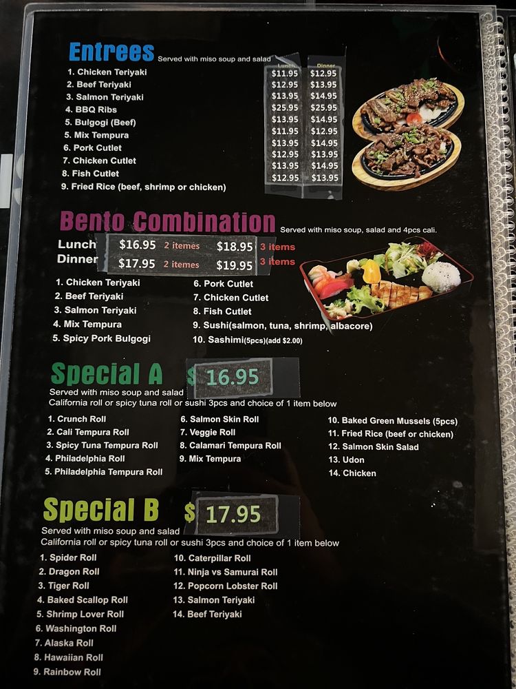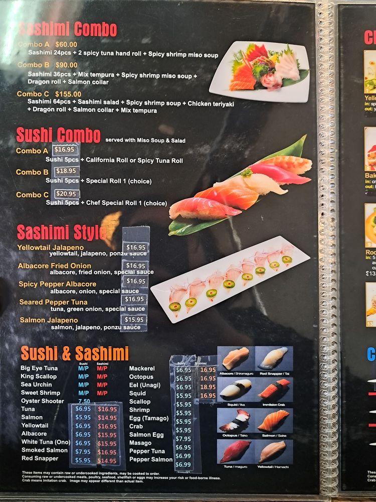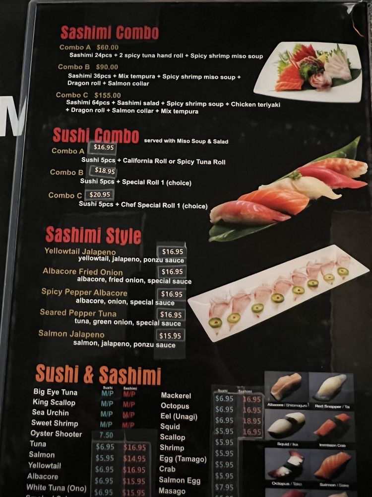 64 pieces sashimi, sashimi salad, spicy shrimp soup, chicken teriyaki, dragon roll, salmon colar and mix tempura.