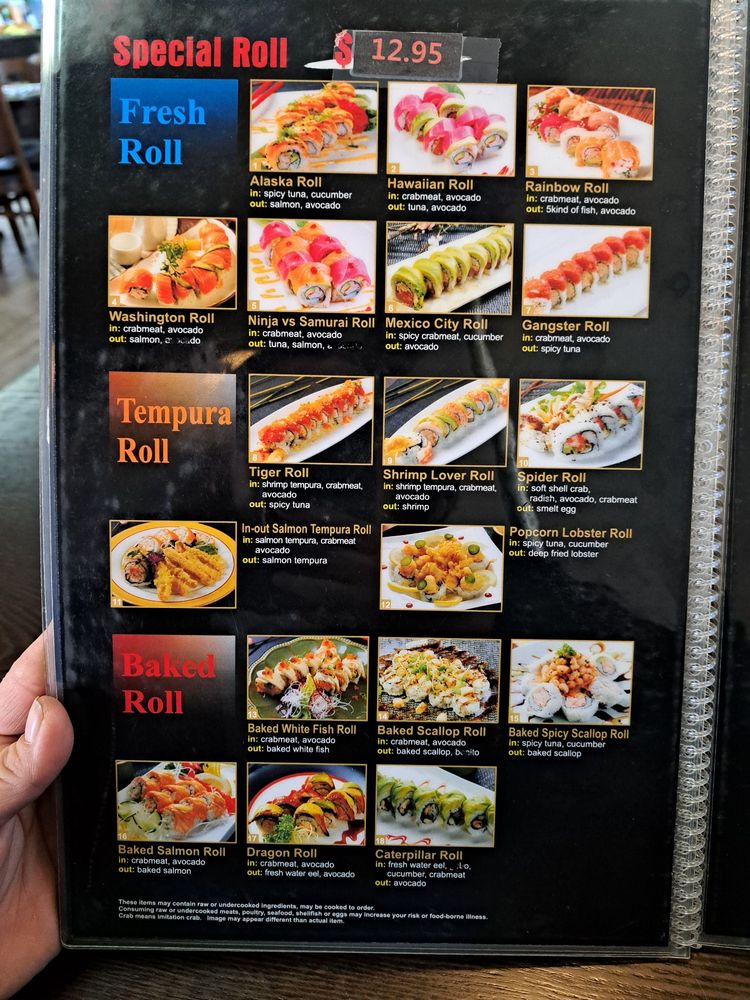 5 pieces roll and 3 pieces veggie tempura. Crabmeat, avocado and shrimp tempura on the inside.