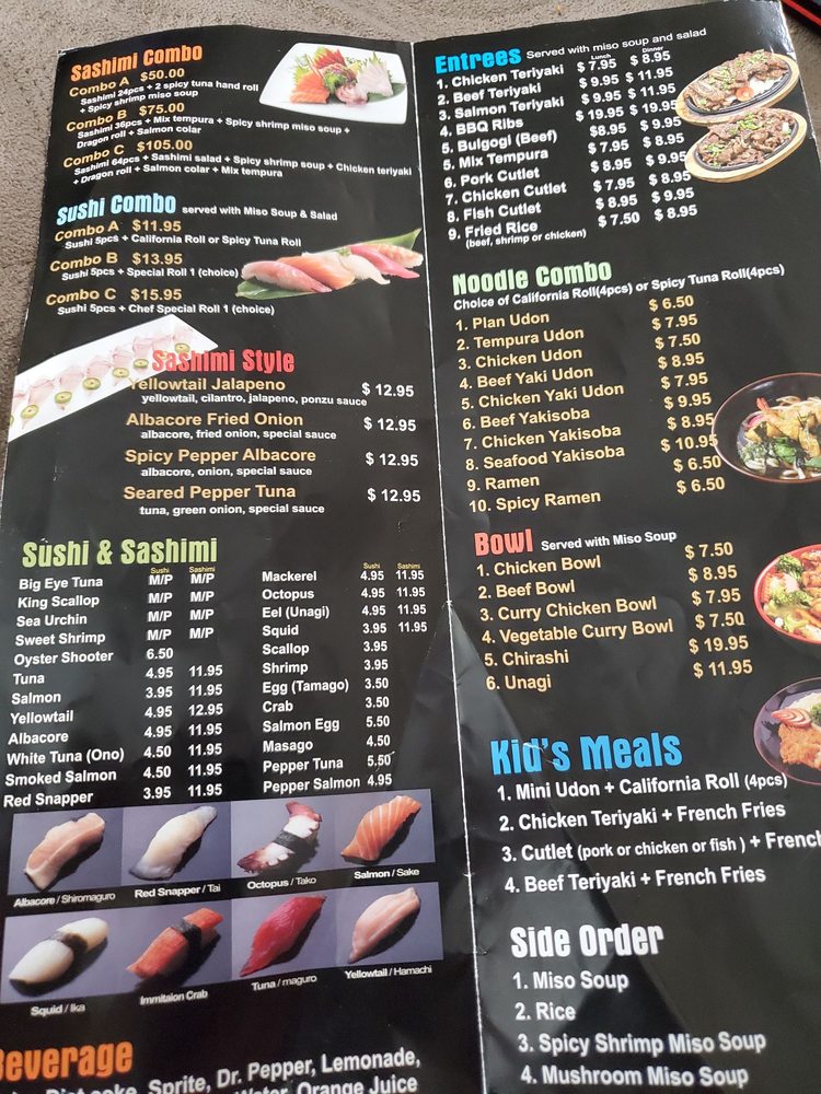 36 pieces sashimi, mix tempura, spicy shrimp miso soup, dragon roll and salmon colar.